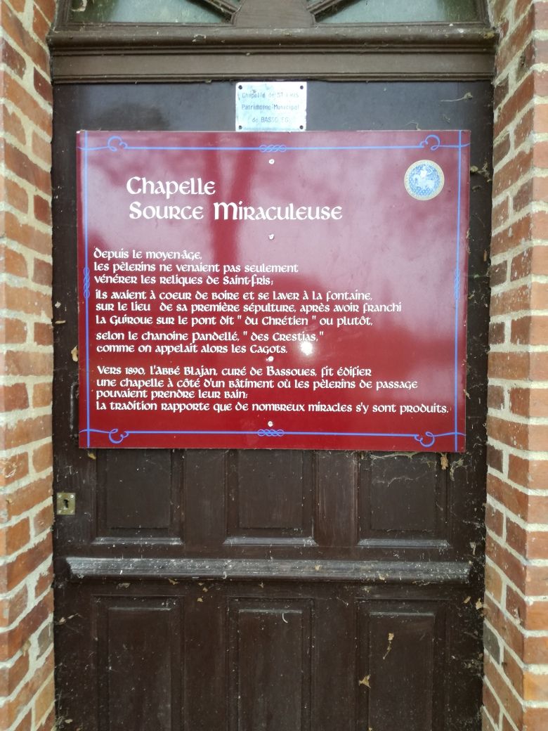 Les chanoines de Bassoues racontent un peu plus loin, dans le même récit « qu'une femme du hameau d'Andréou, ayant voulu se servir de l'eau de cette même fontaine pour pétrir son pain, vit avec terreur cette eau se changer en sang ». Ce miracle et une multitude d'autres, dont le récit nous a a été conservé, portèrent bien loin la renommée de saint Fris, de sa chapelle et de sa fontaine. Cette fontaine, où des pèlerins innombrables ont trouvé et trouvent encore la guérison de leurs maux, a été restaurée dans ces derniers temps. On y voit un gracieux oratoire avec sa cloche argentine, que sonnent à toute heure les pèlerins de passage. Tout à côté est une piscine où ils vont fréquemment se baigner»